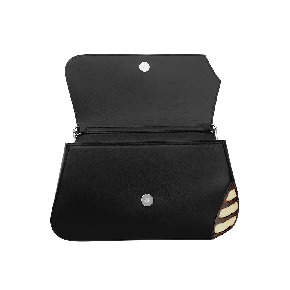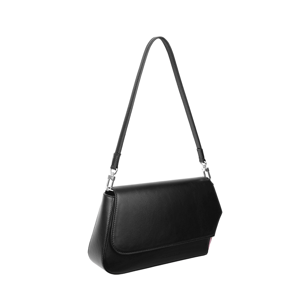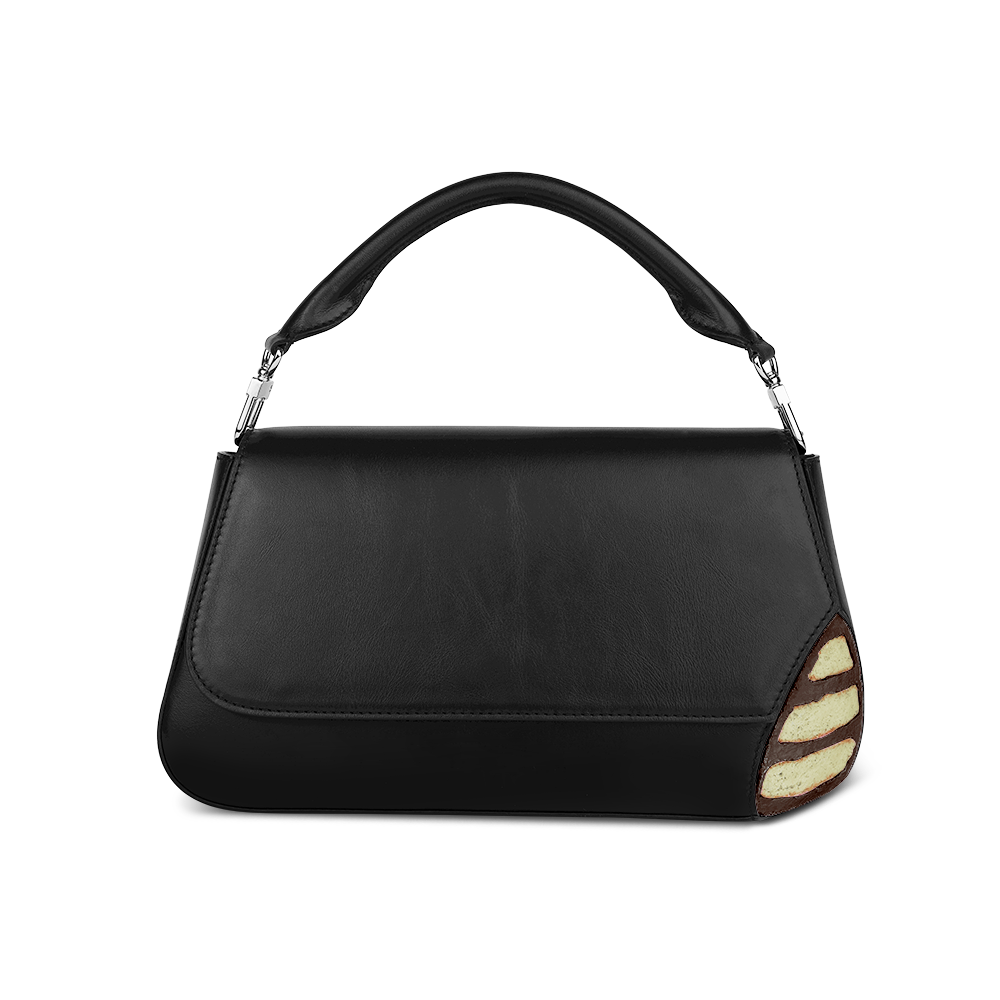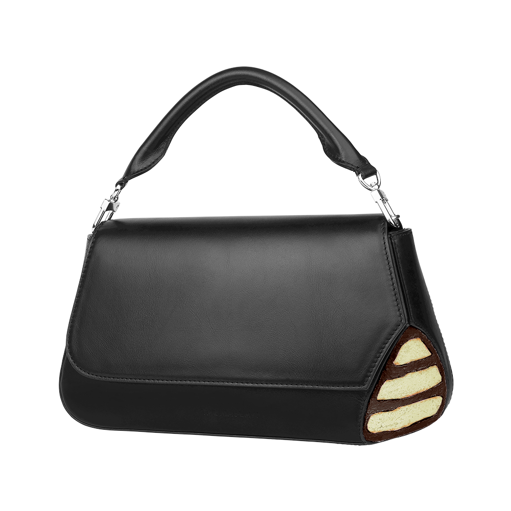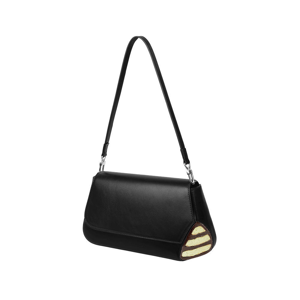 Black leather shoulder bag featuring a meticulously crafted sliced sponge cake plastic insert at the corner. Detachable top handle and shoulder strap.