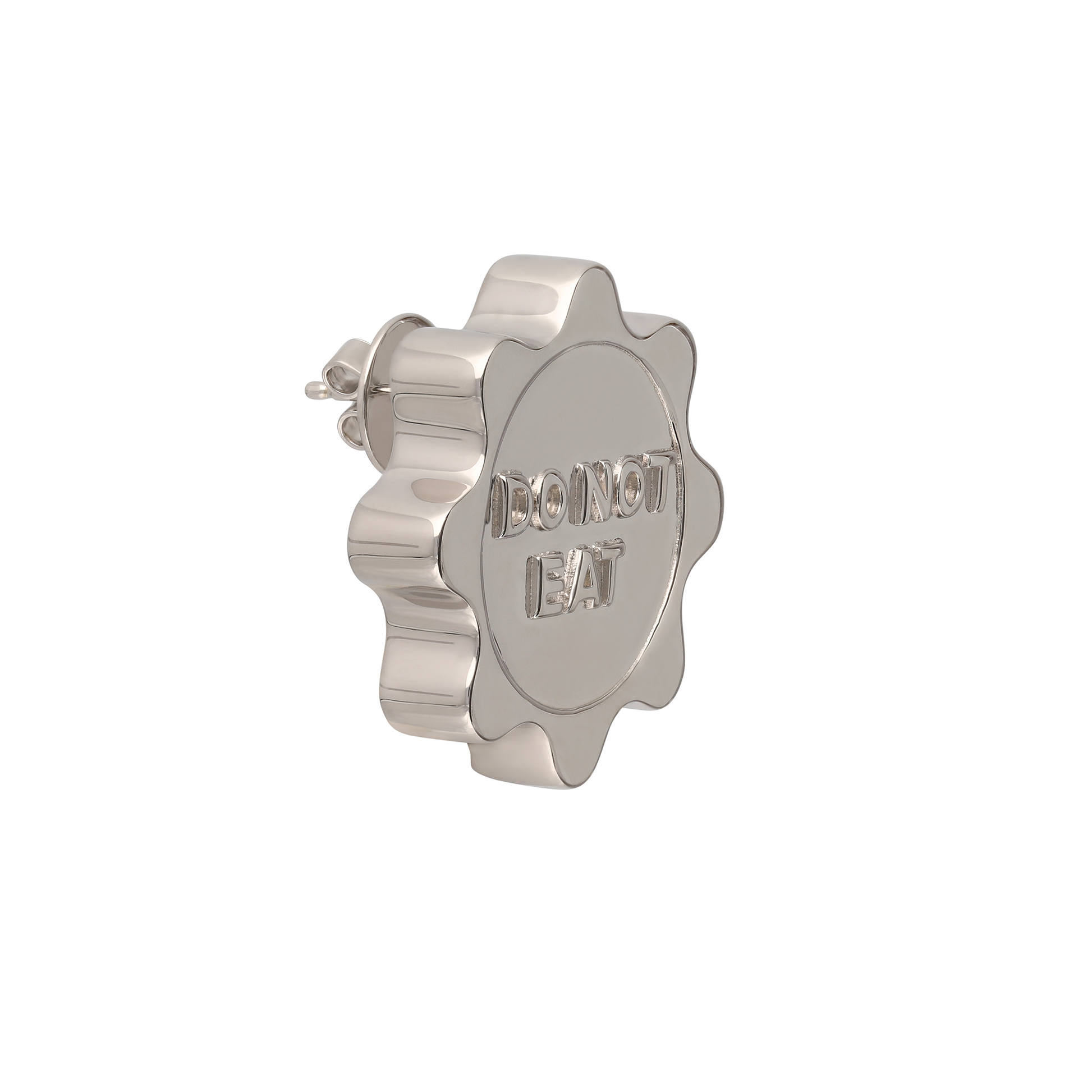 Single flower-shaped stud earring engraved with "DO NOT EAT", made of 925 sterling silver with rhodium plating.