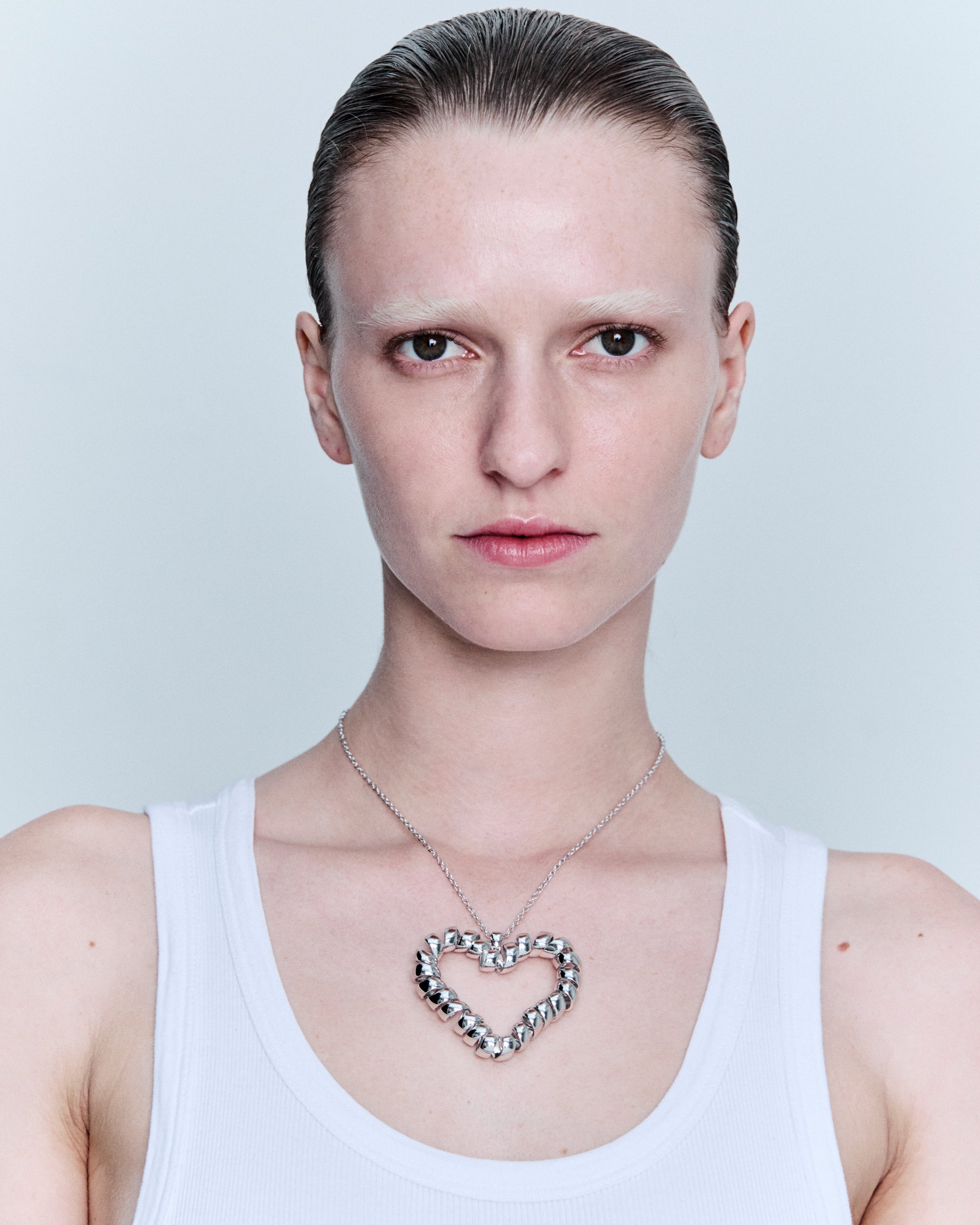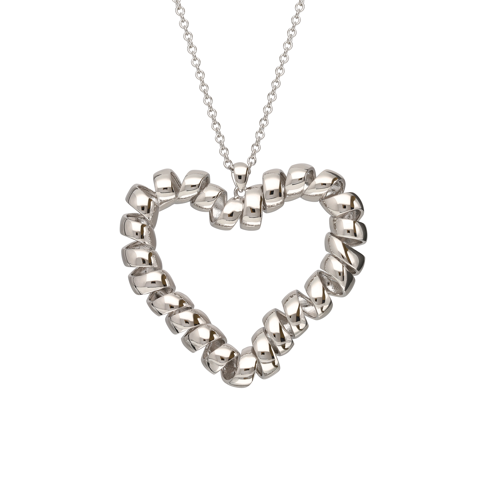 Necklace with a heart-shaped spring pendant, made of rhodium-plated brass.