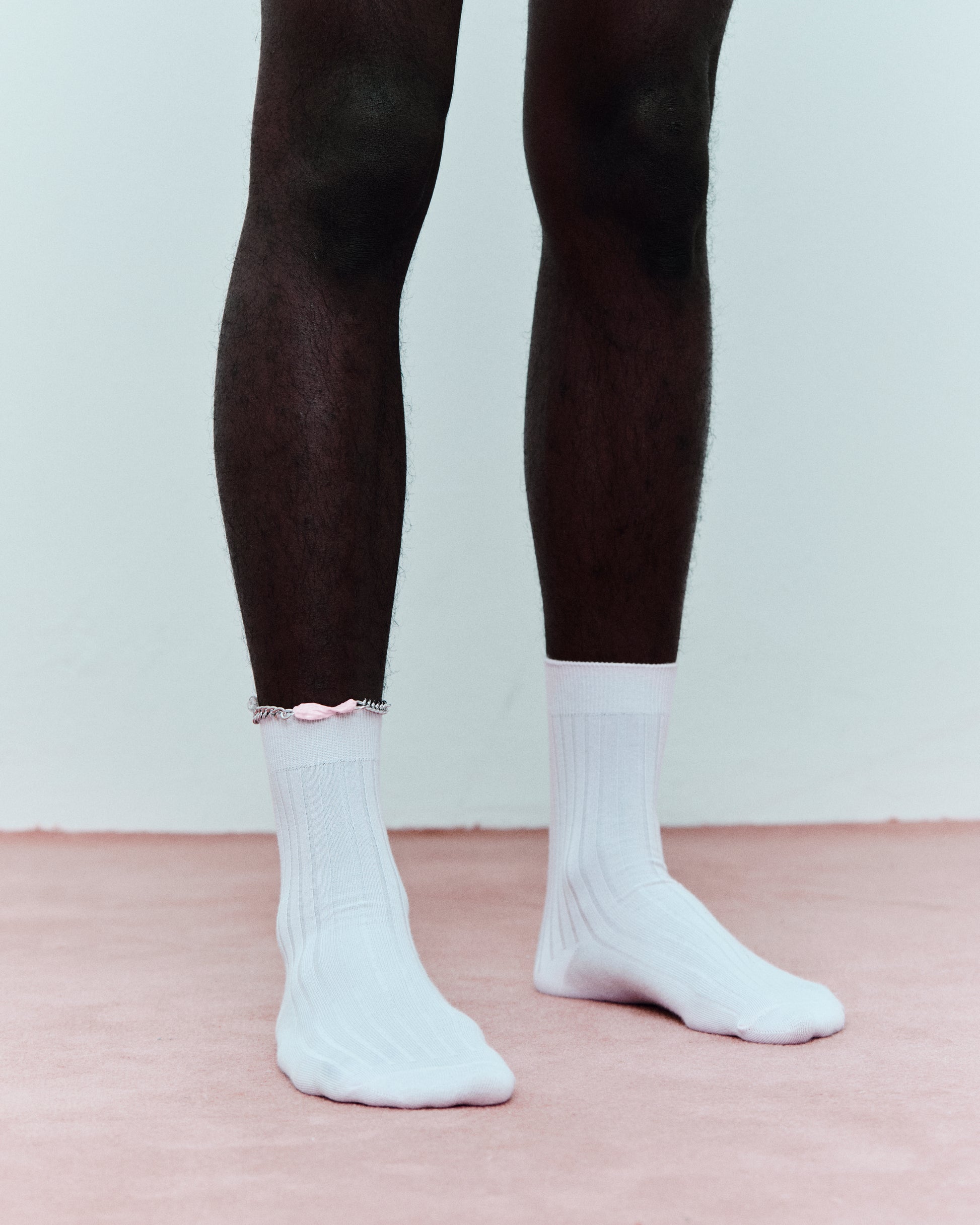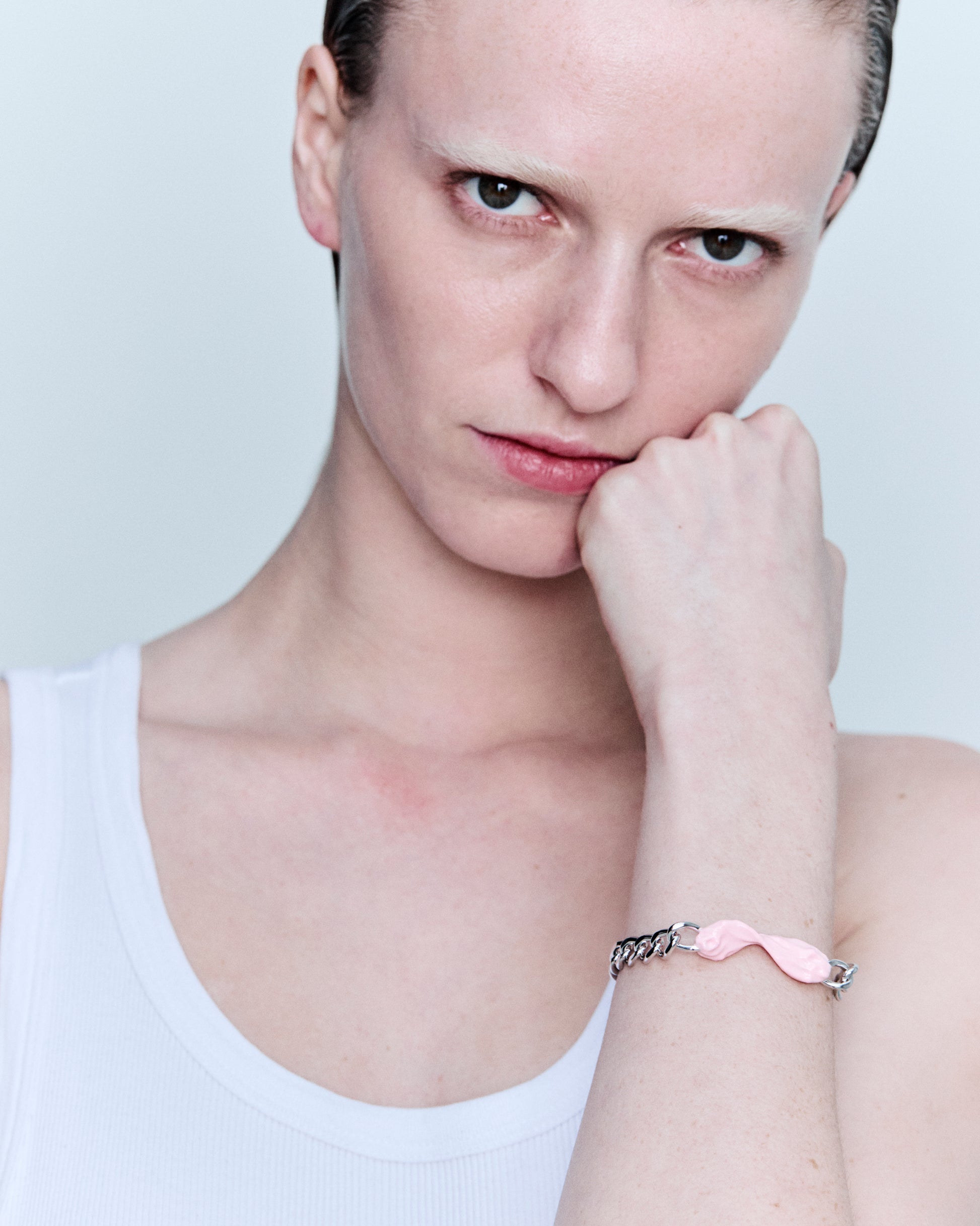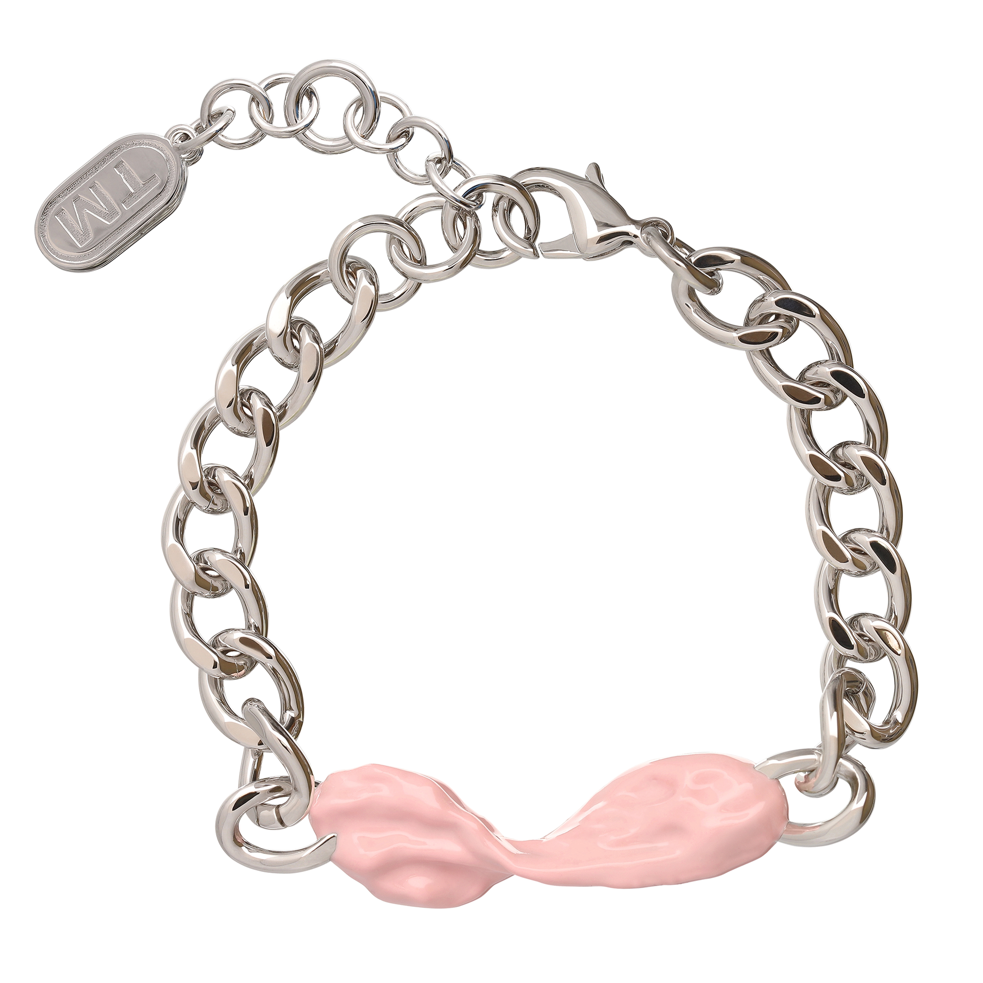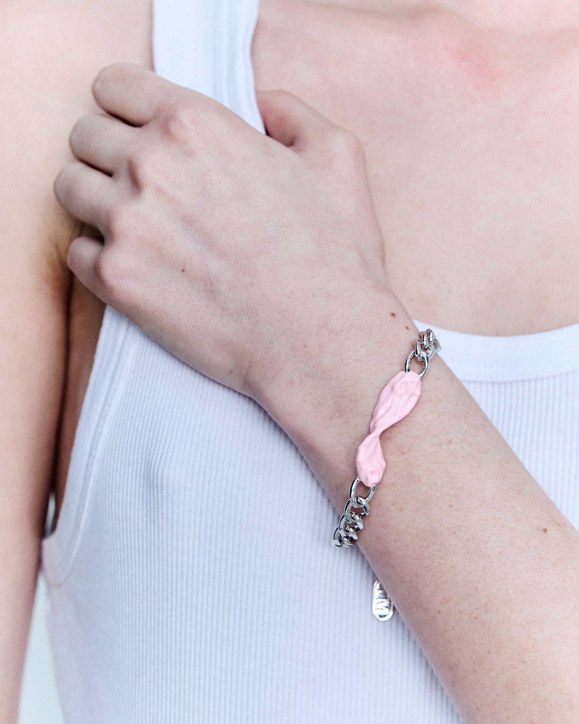 Link bracelet featuring a taut gum design, made of rhodium-plated brass and enamel.