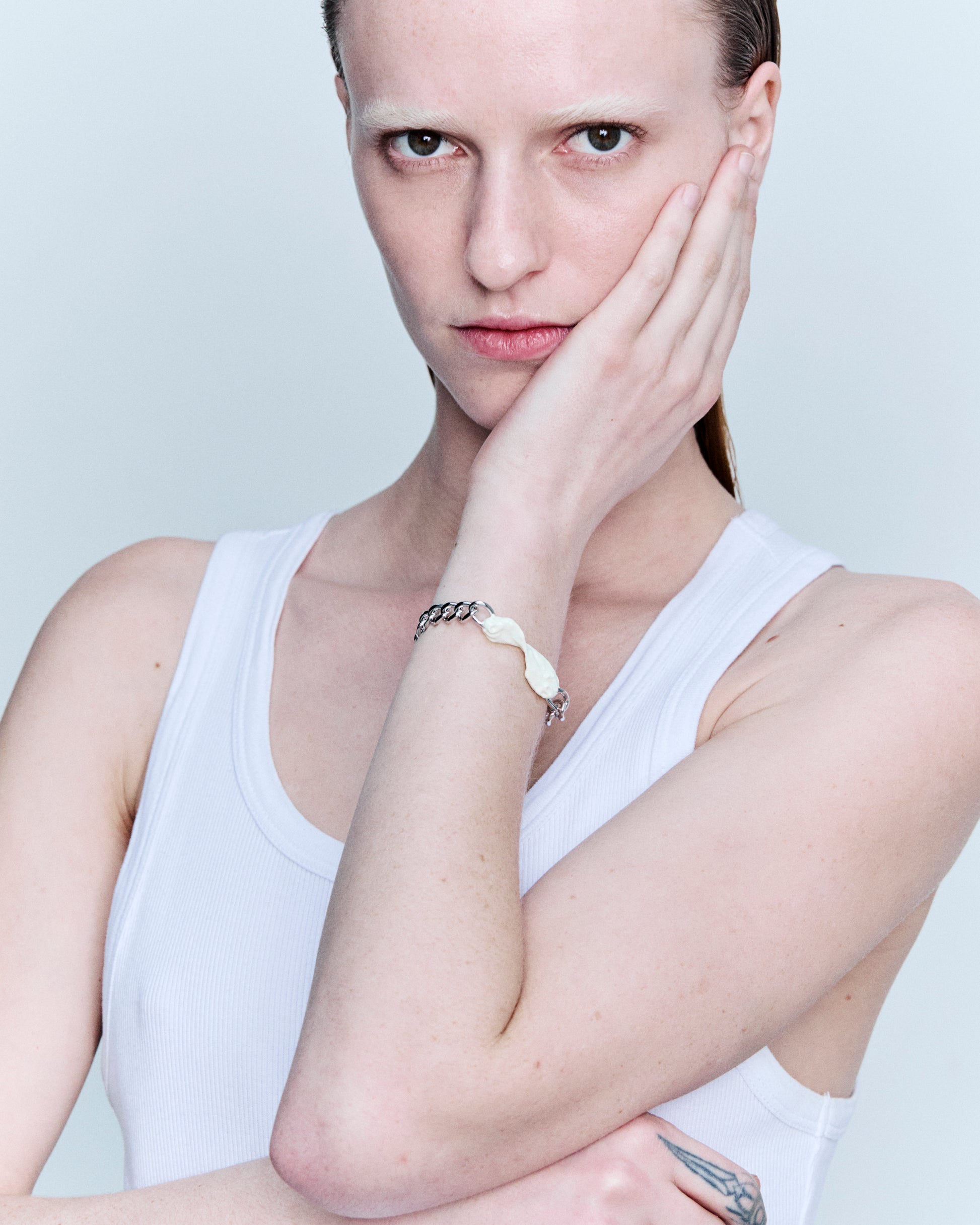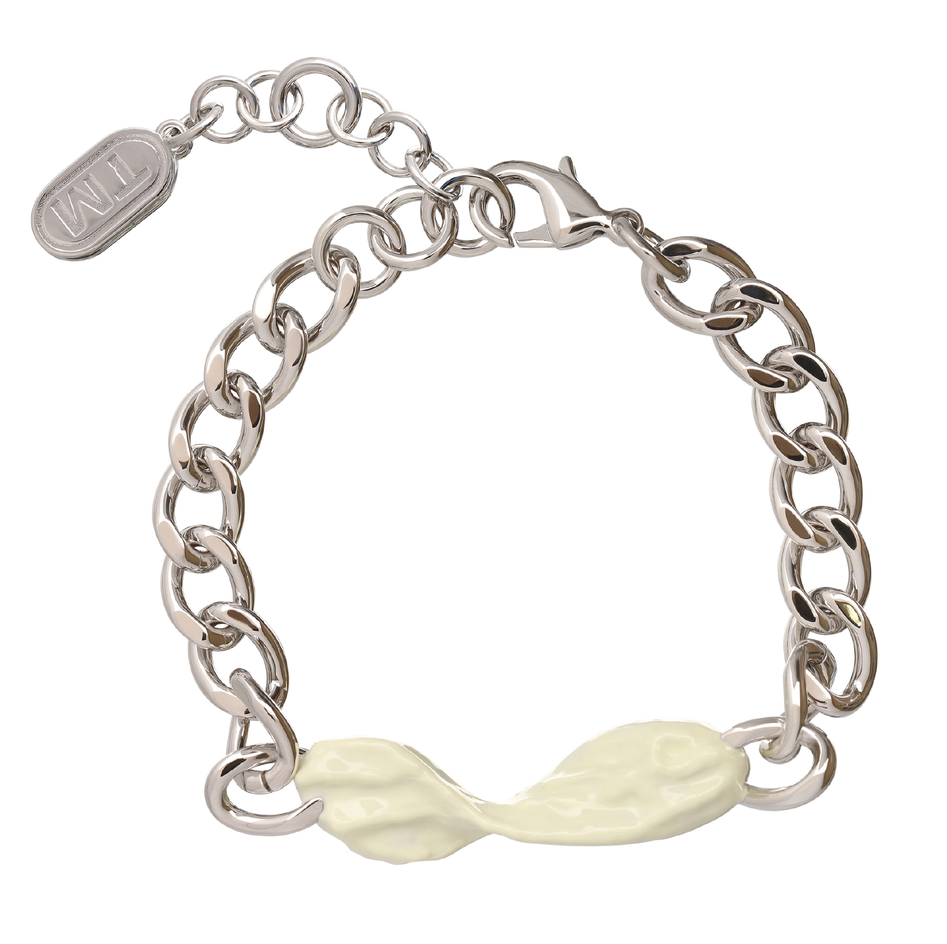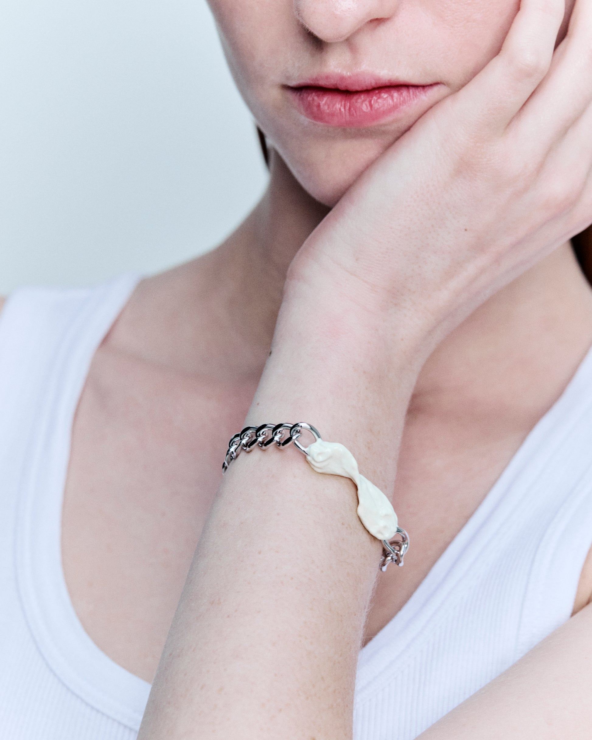 Link bracelet featuring a taut gum design, made of rhodium-plated brass and enamel.