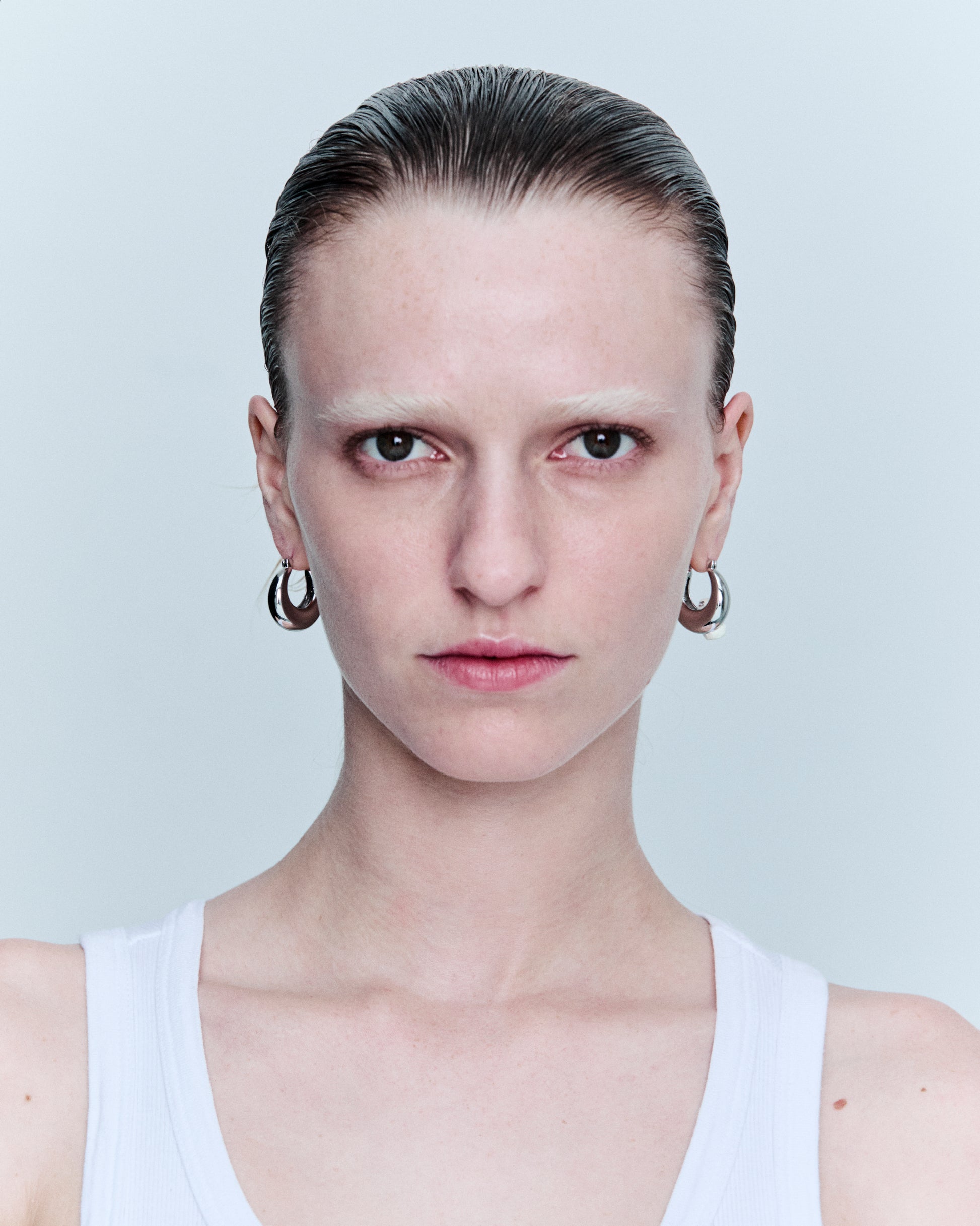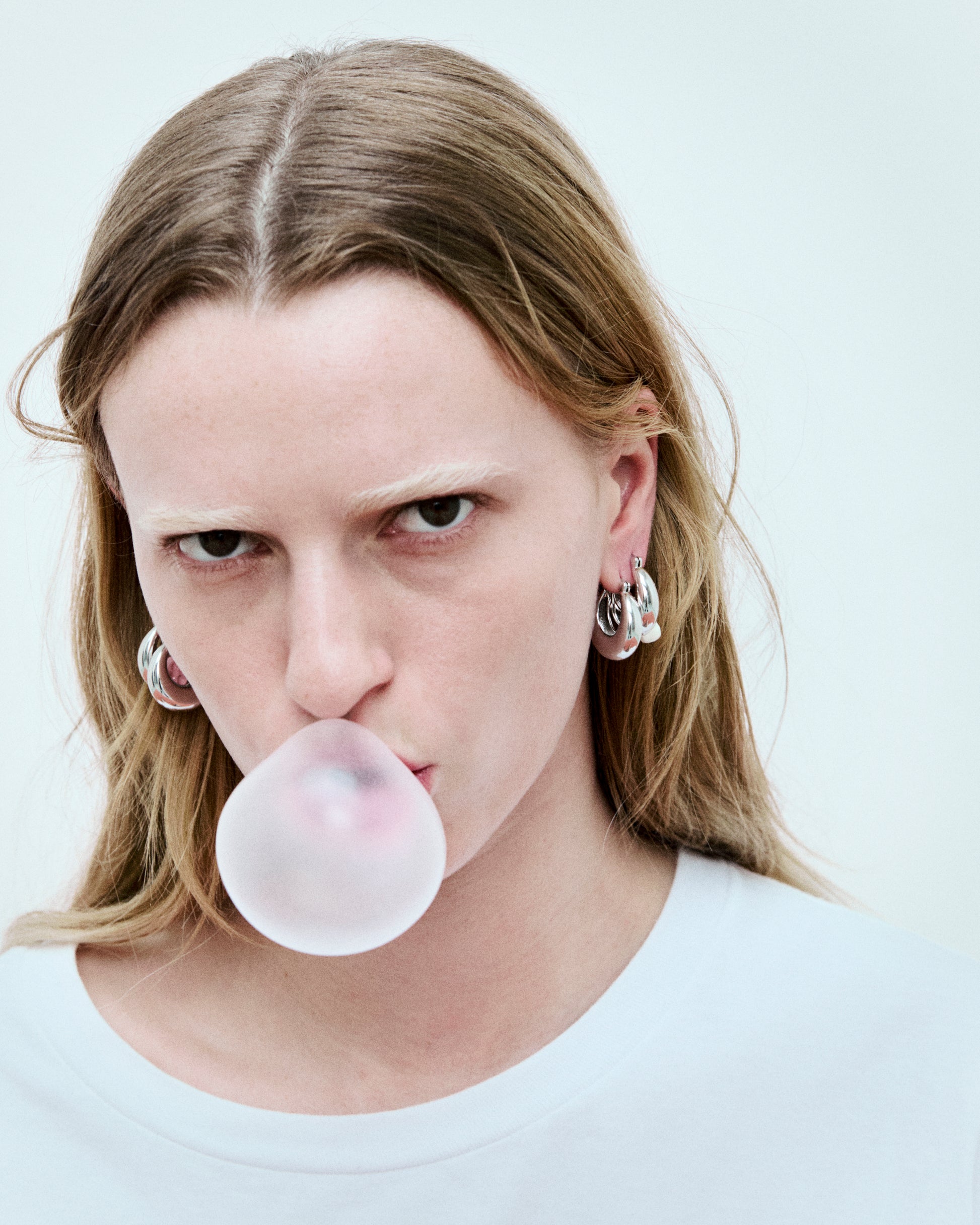 Pair of hoop earrings, with a chewed gum design attached to one earring. Made of rhodium-plated brass and enamel.