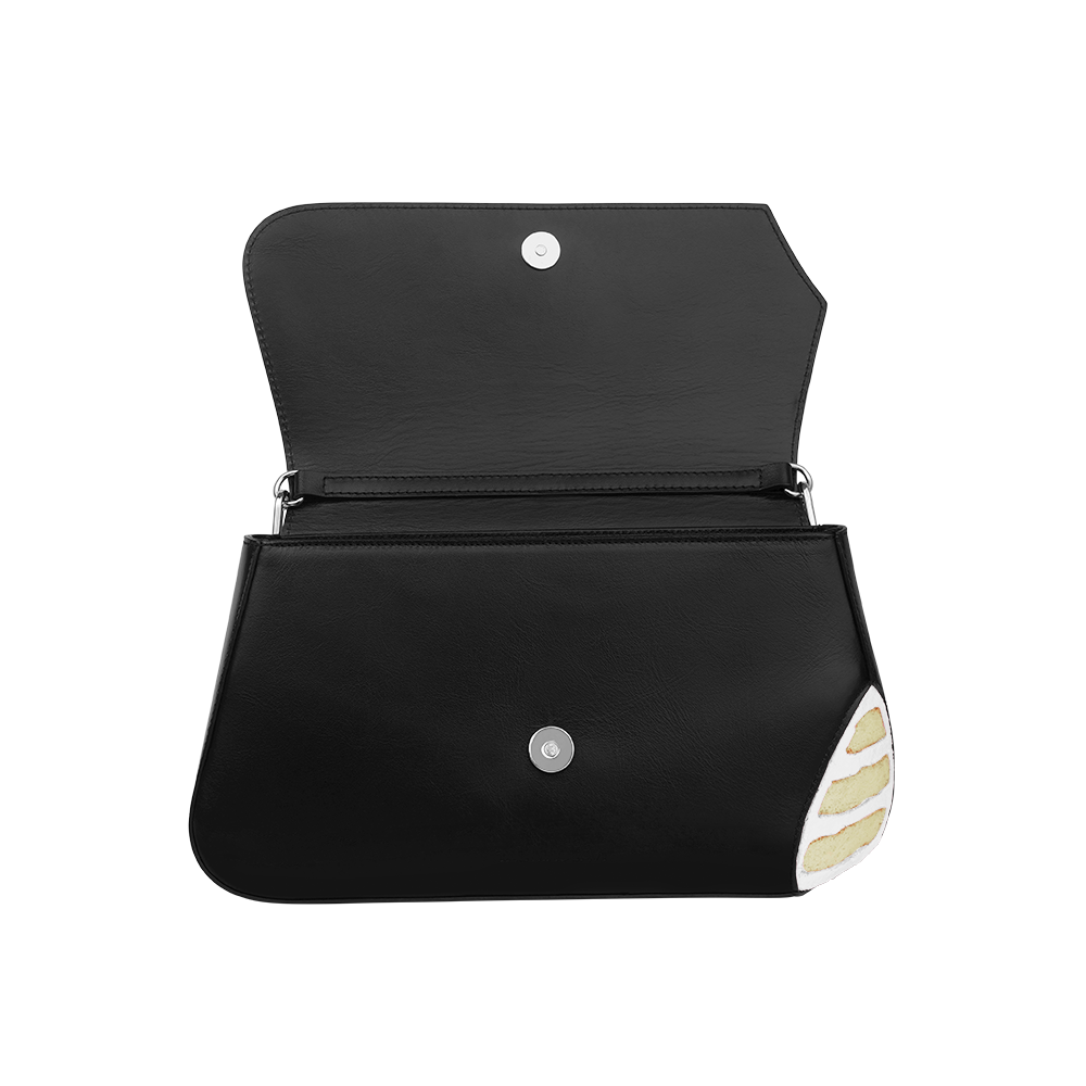 Black leather shoulder bag featuring a meticulously crafted sliced sponge cake plastic insert at the corner. Detachable top handle and shoulder strap.
