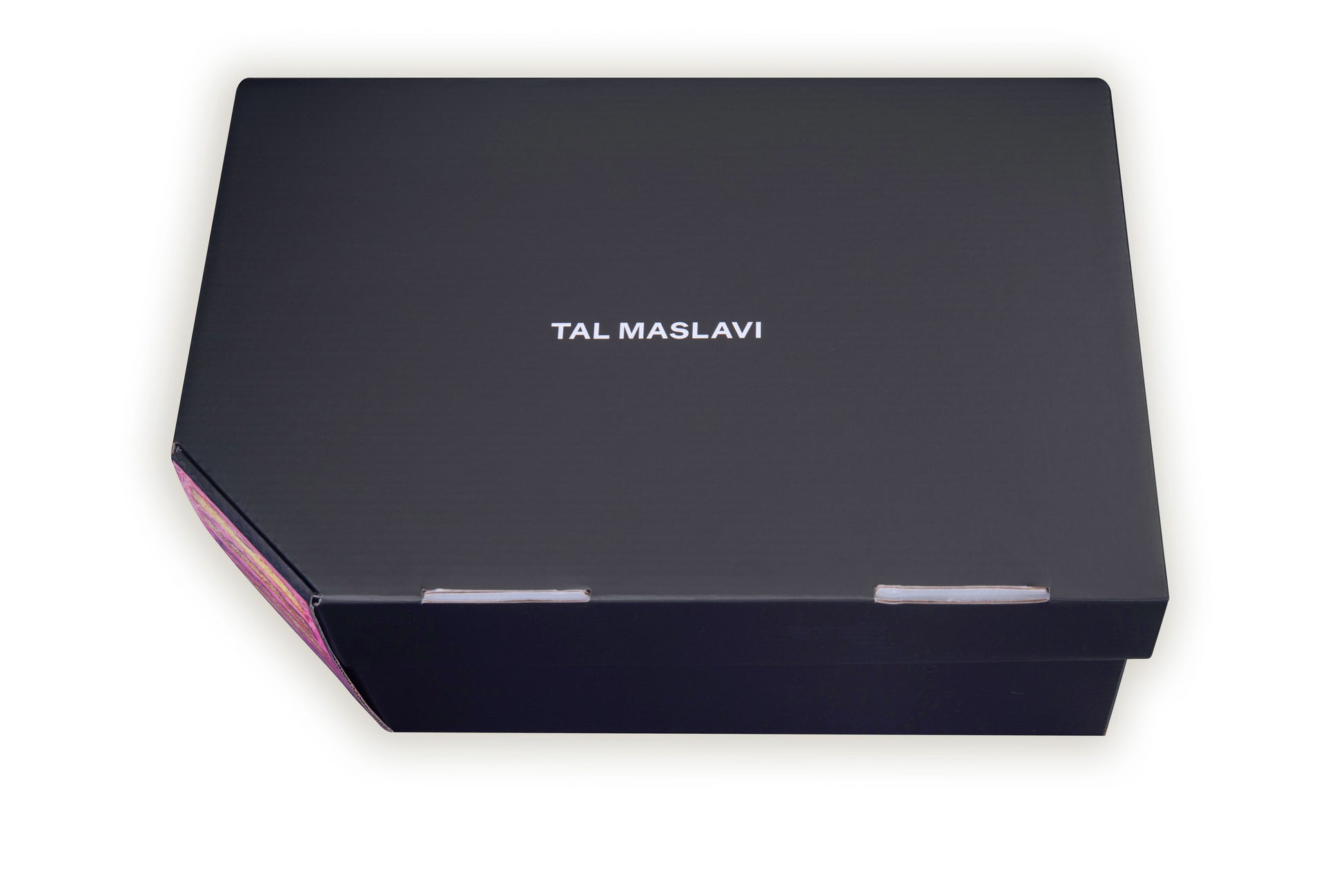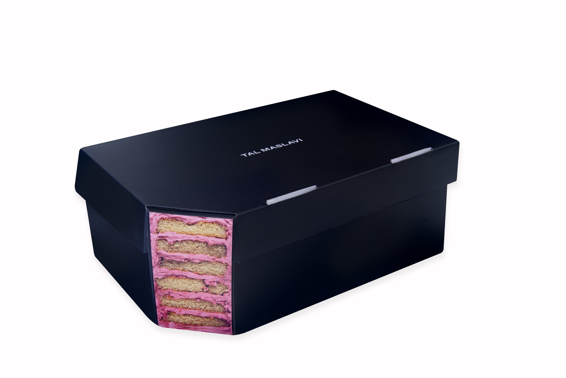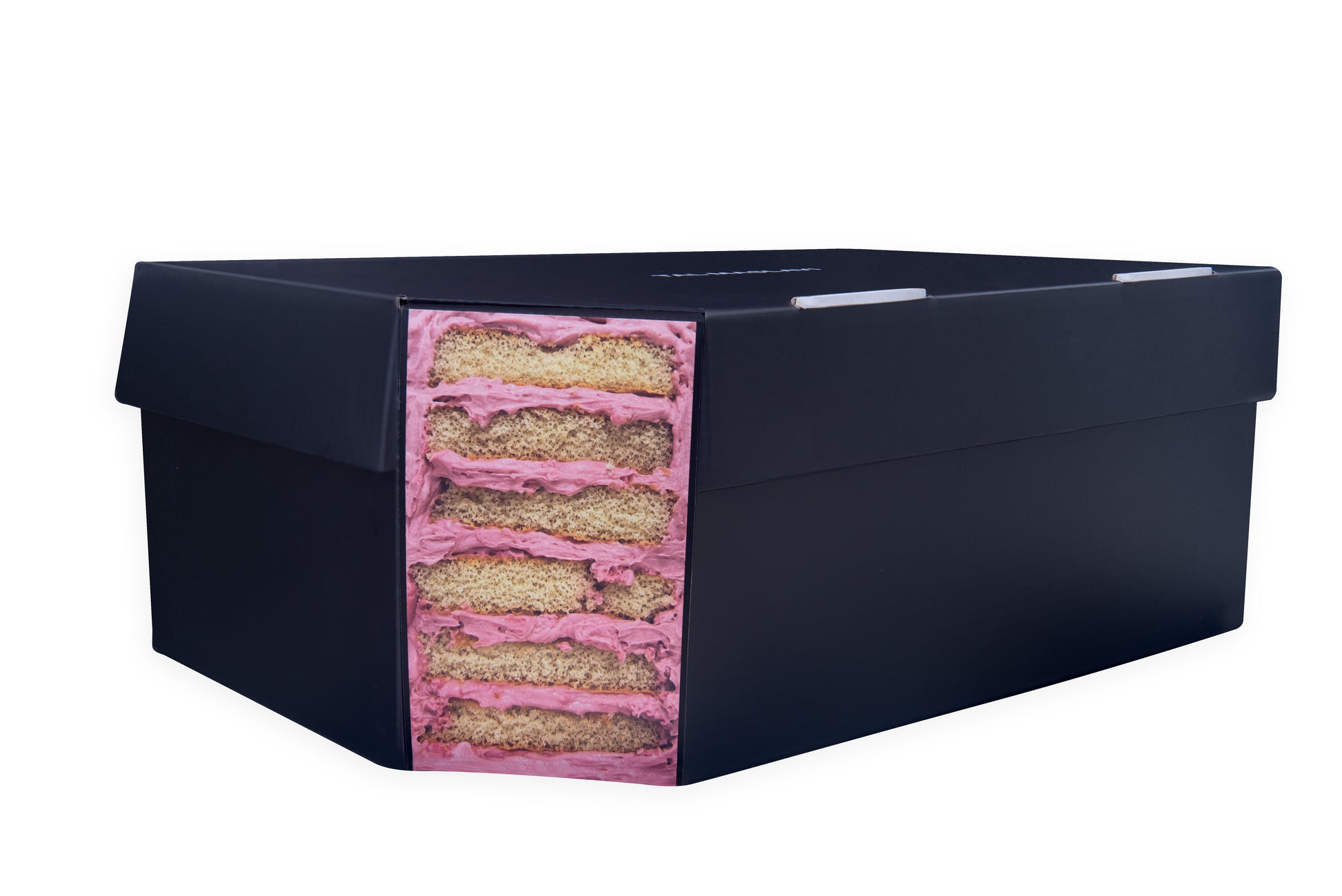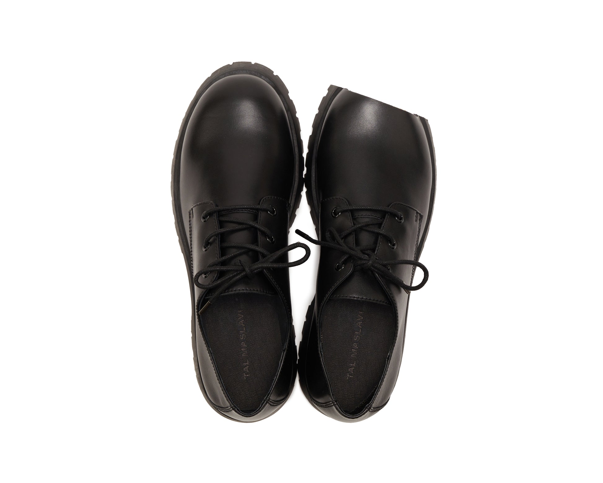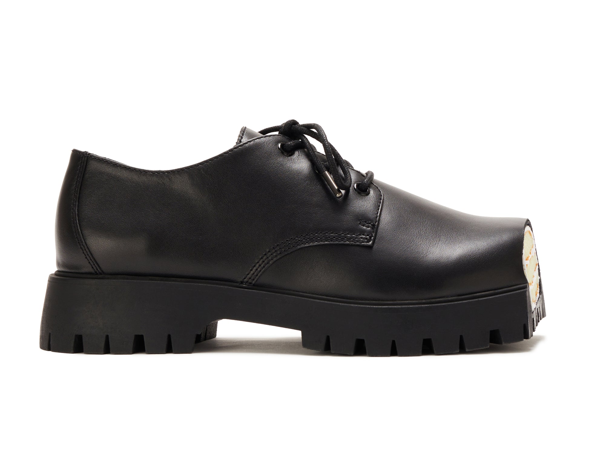 Black derby shoes with a handmade sliced sponge cake plastic insert on the right toe box.